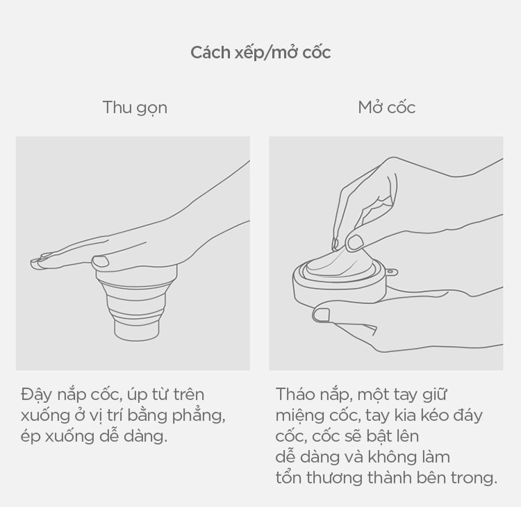 Tuy vậy, trong một số tình huống, việc đem theo 1 cái ly/cốc hơi chiếm chỗ làm cho chúng ta bị lúng túng khi sắp xếp đồ đạc. Do đó, mình thấy chiếc ly/cốc bằng nhựa an toàn có thể gấp lại được, bỏ gọn vào túi nhỏ thiệt là tiện lợi. Vừa có ly uống nước riêng của mình, vừa không phải lăn tăn để nó ở đâu cho gọn, cho khỏi bị cấn bể, quả là nhẹ nhõm, đúng không cả nhà?