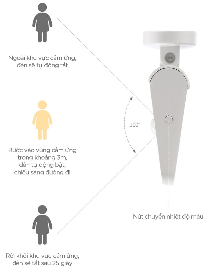 Vào ban đêm hay khi ánh sáng không đủ, chỉ cần có người bước vào vùng cảm ứng ở khoảng cách 3m, đèn sẽ tự động bật ánh sáng rọi đường. Sau khi người đó rời khỏi vùng cảm ứng 25 giây thì đèn sẽ tắt. Nếu là ban ngày hoặc trong vùng đủ ánh sáng, đèn sẽ không bật sáng dù có người chạm vào đi nữa. Đúng là một sản phẩm thông minh phù hợp với những ngôi nhà hiện đại.